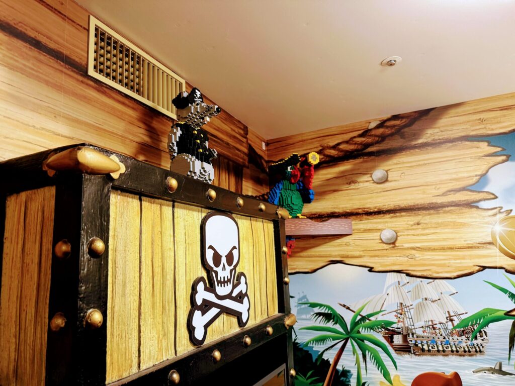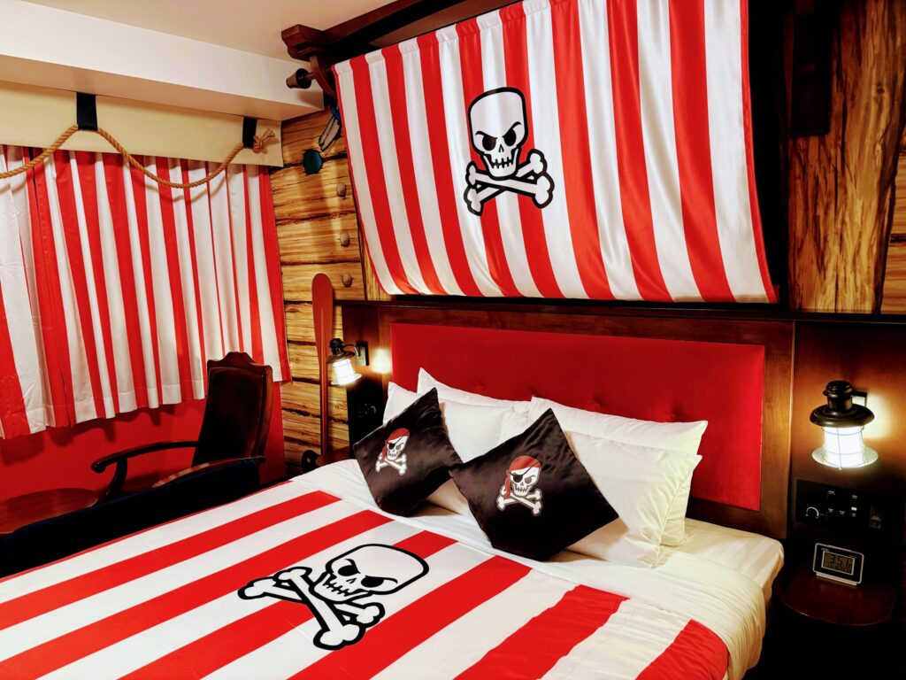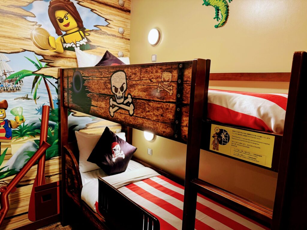 レゴランドホテルの客室はフロアにより、パイレーツ、キングダム、アドベンチャー、ニンジャゴーなど、テーマに分かれています。客室内はテーマに沿ってレゴでつくられたオブジェなどの装飾が施されており、宝探しトレジャーボックスや2段ベッドなど、子どもが楽しめる仕掛けもあります。